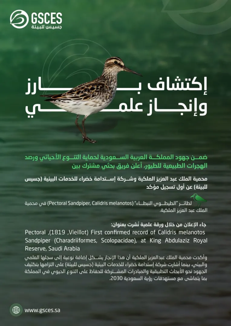 نشرت شركة إستدامة خضراء للخدمات البيئية (#جسيس_للبيئة)وبالتعاون مع محمية الملك عبدالعزيز الملكية ، ورقة علمية عن أول تسجيل مؤكد للطائر المائي النادر "الطيطوي النبطاء Calidris melanotos" داخل محمية في المملكة،